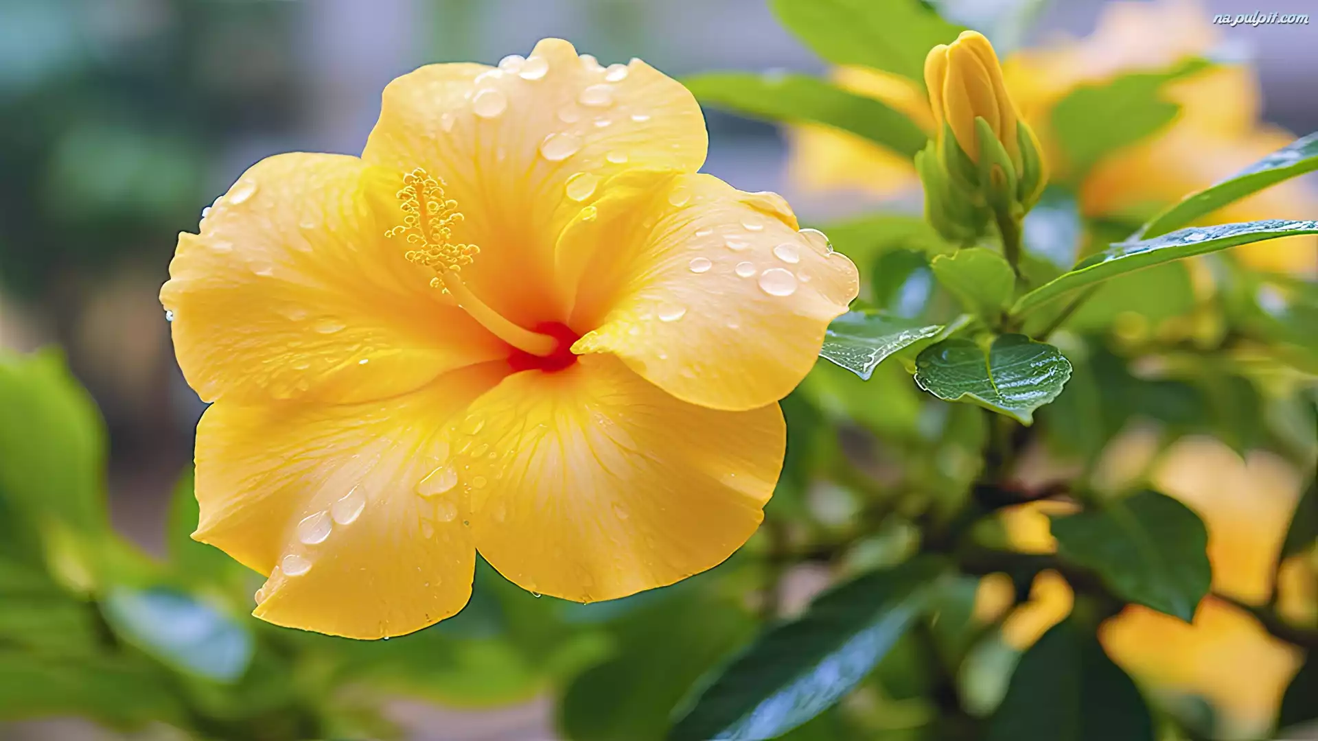 Żółty, Hibiskus, Pąk, Krople Na Pulpit