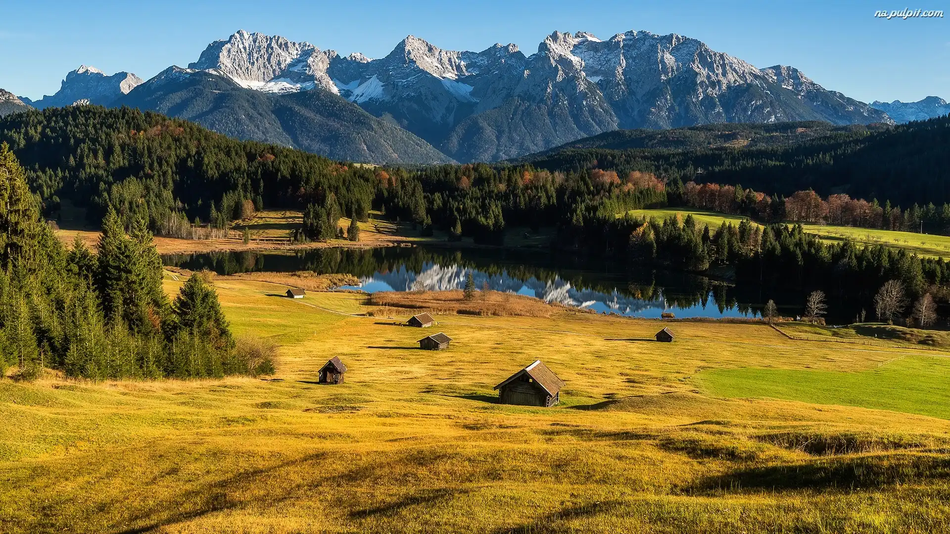 Niemcy, Góry Alpy, Bawaria, Lasy, Domki, Jezioro Geroldsee, Miejscowość Krun Na Pulpit