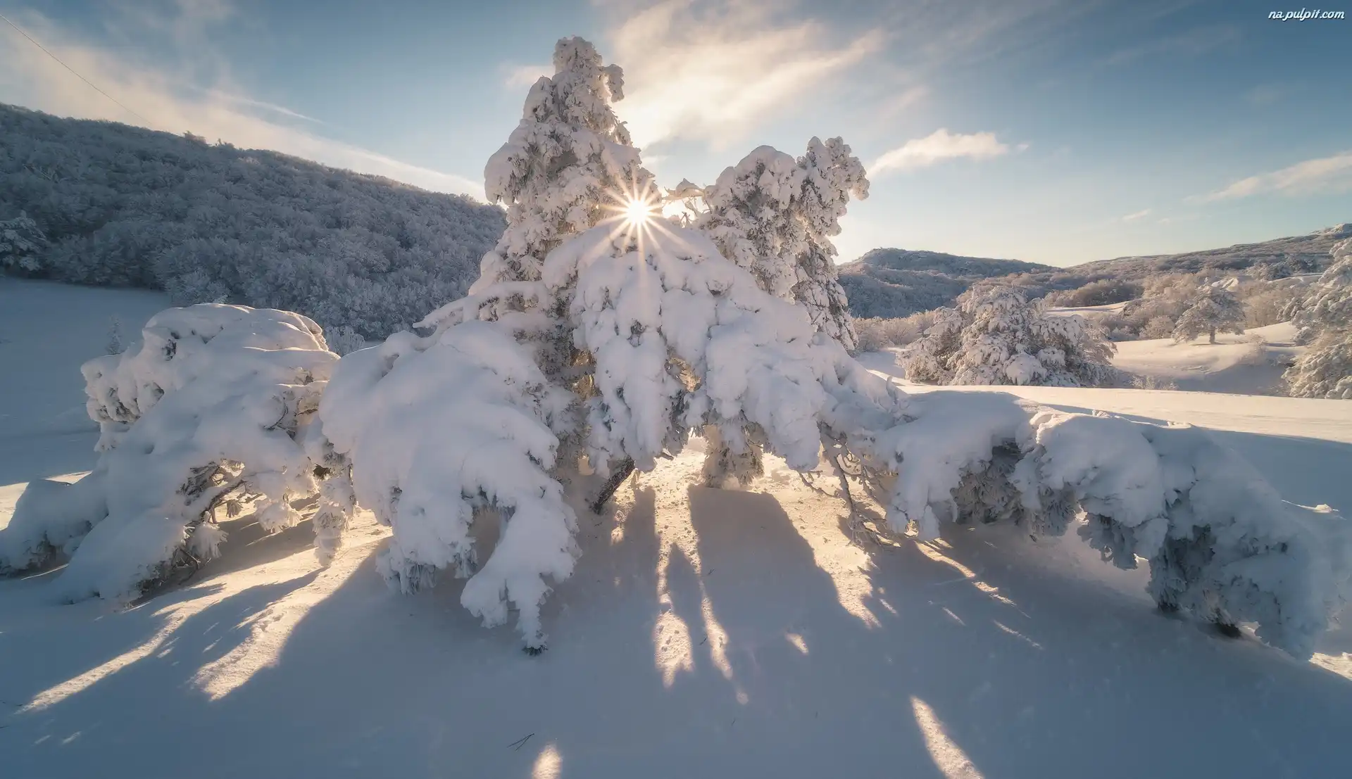 Śnieg, Ukraina, Promienie słońca, Drzewa, Zima, Góry Krymskie Na Pulpit