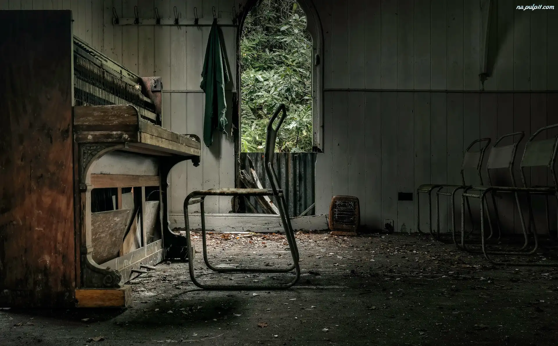 Krzesła, Zniszczone, Pianino, Stare, Wnętrze