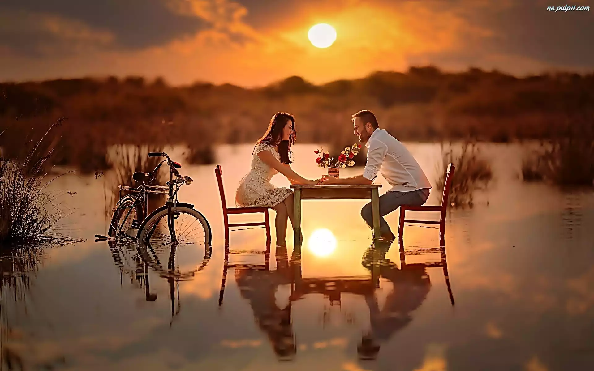 Zachód słońca, Stół, Rower, Rozlewisko, Kobieta, Mężczyzna, Krzesła