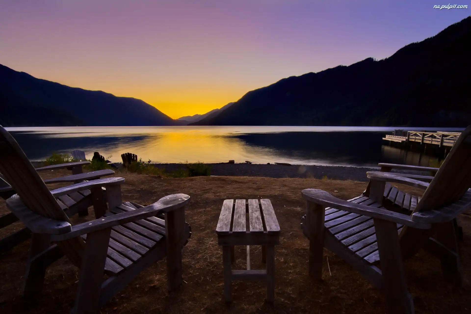 Krzesła, Góry, Słońca, Zachód, Jezioro