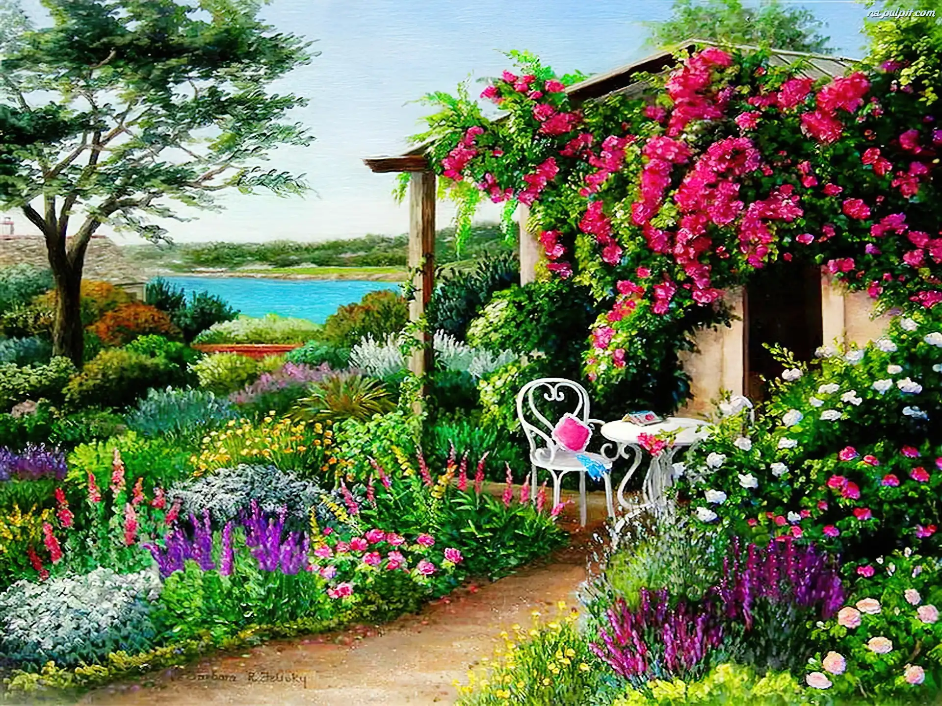 Krzesło, Kwiaty, Altanka, Ogród, Stolik Na Pulpit