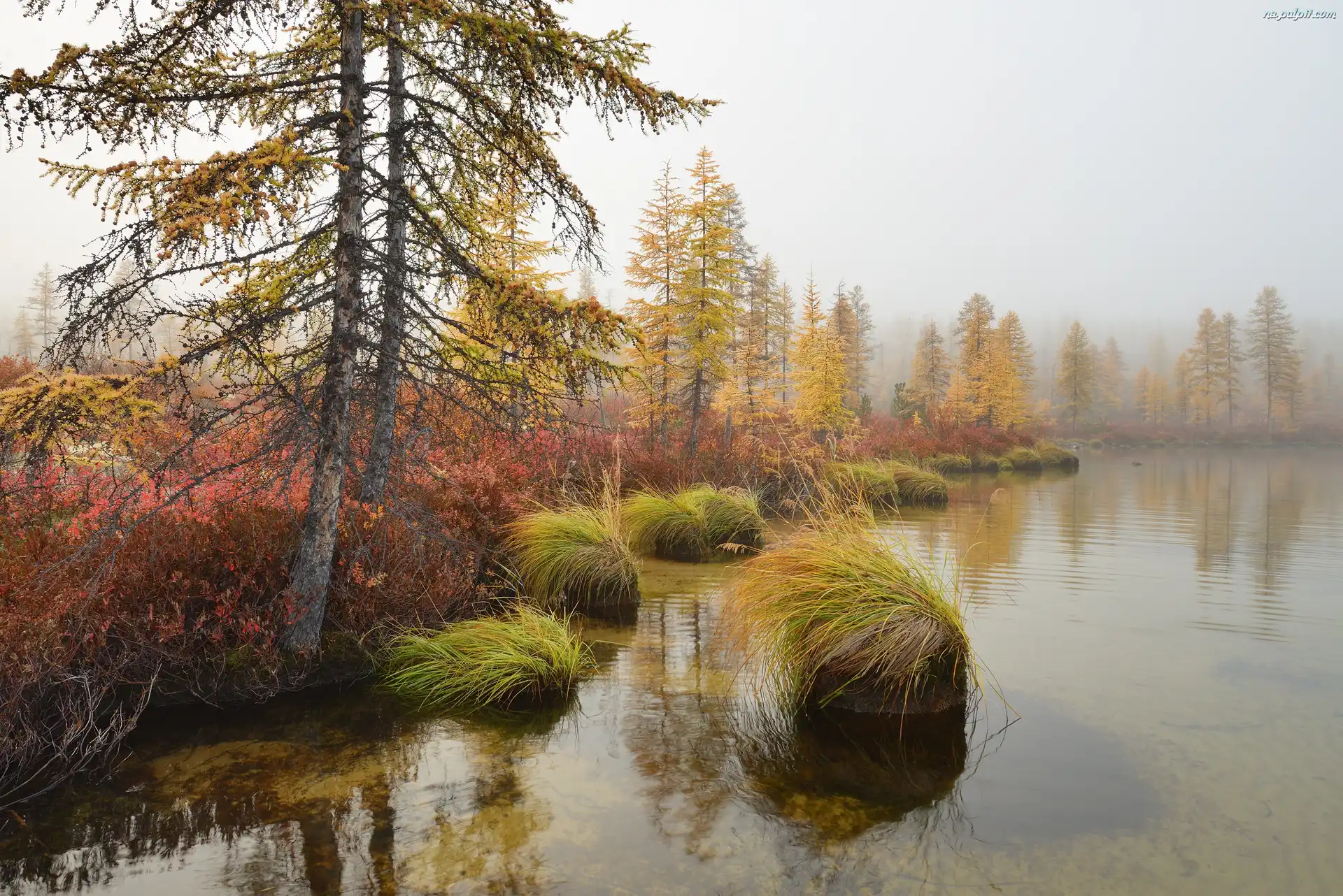 Trawa, Jezioro Jack London, Mgła, Kołyma, Rosja, Drzewa, Jesień, Krzewy