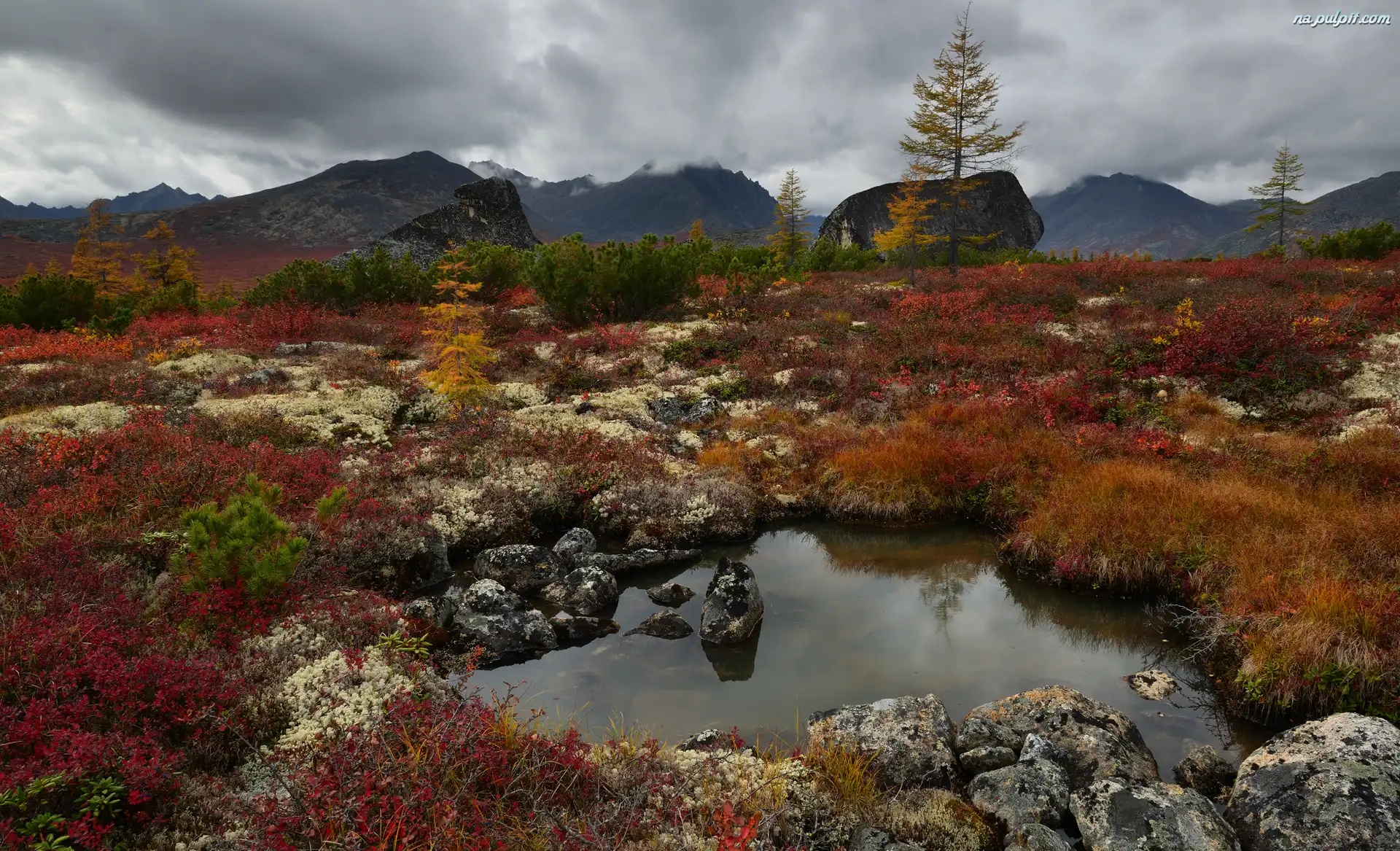 Kołyma, Drzewa, Krzewy, Kamienie, Obwód magadański, Rosja, Skały, Rośliny, Góry Kołymskie Na Pulpit |