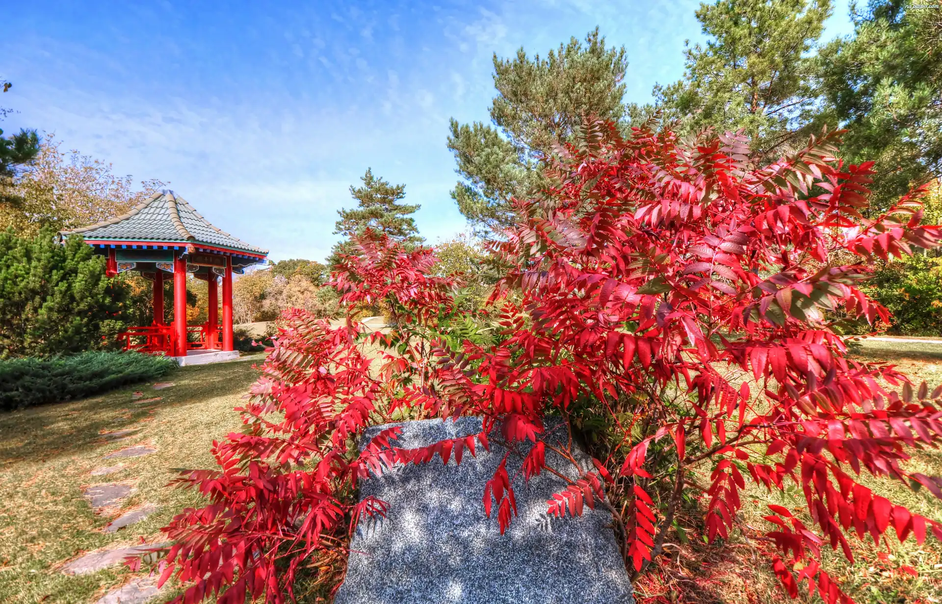 Krzewy, Czerwona, Altana, Drzewa, Ogród, Kamień