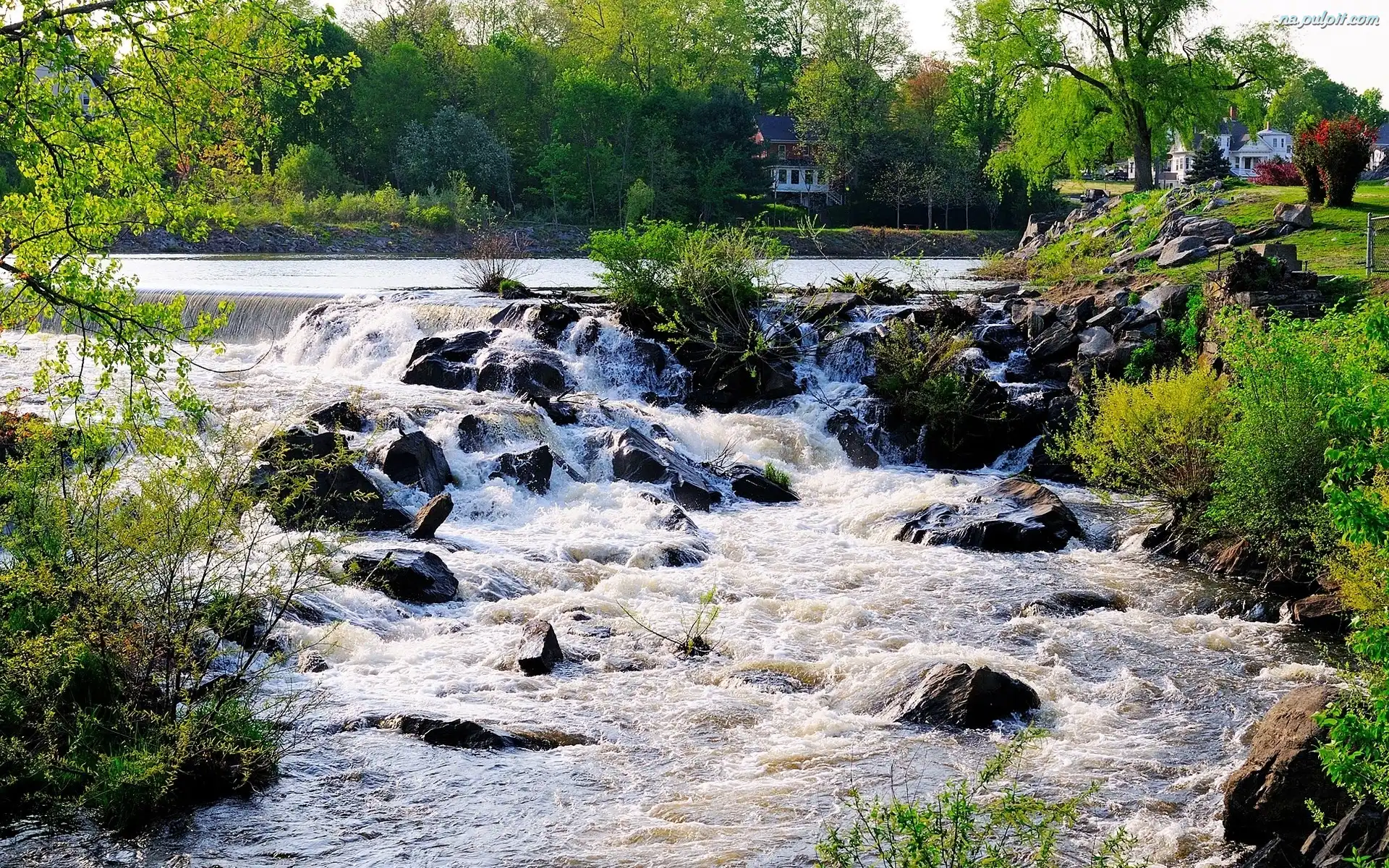 Krzewy, Wodospad, Rzeka, Kamienie Na Pulpit