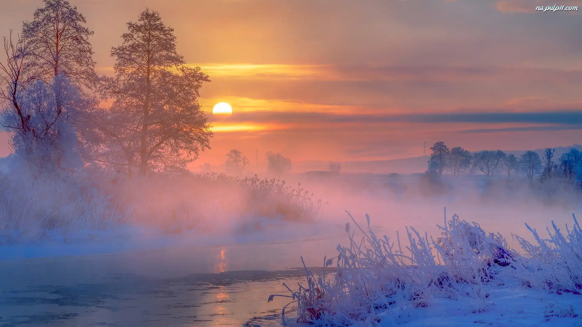 Mgła, Rzeka Gwda, Śnieg, Wschód słońca, Polska, Drzewa, Zima, Krzewy Na Pulpit