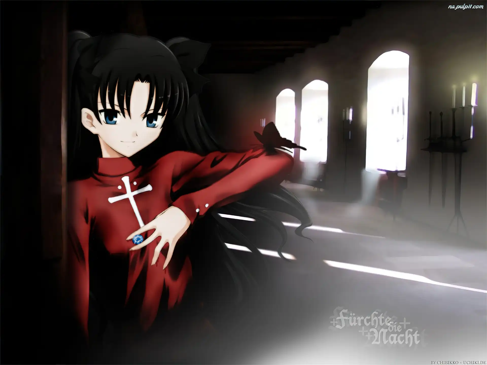 świece, kobieta, okna, napis, korytarz, Fate Stay Night, krzyż Na Pulpit