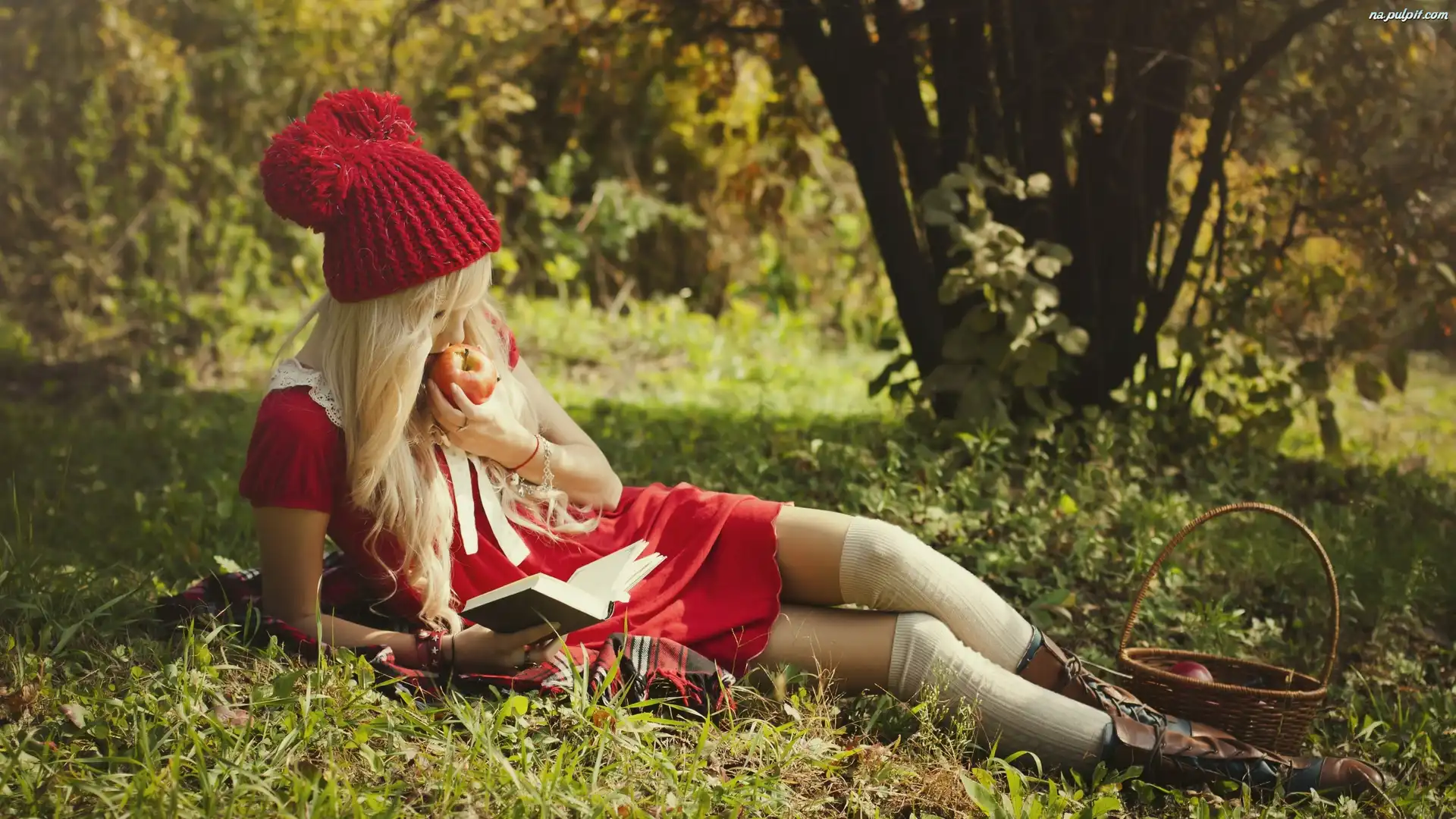 Książka, Kosz, Łąka, Czapka, Blondynka, Jabłka Na Pulpit