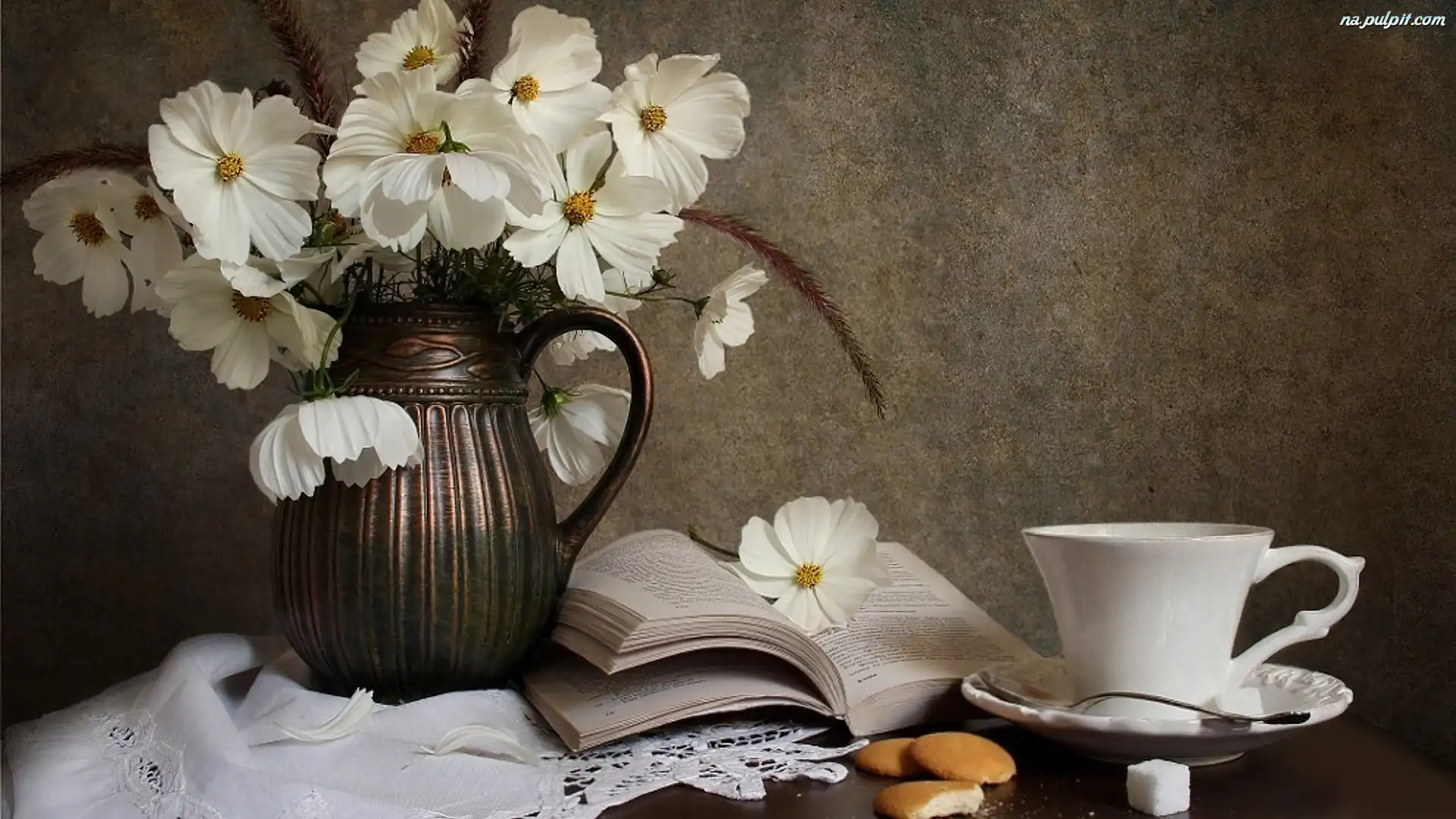 Filiżanka, Flakon, Kosmea, Biała, Książka Na Pulpit