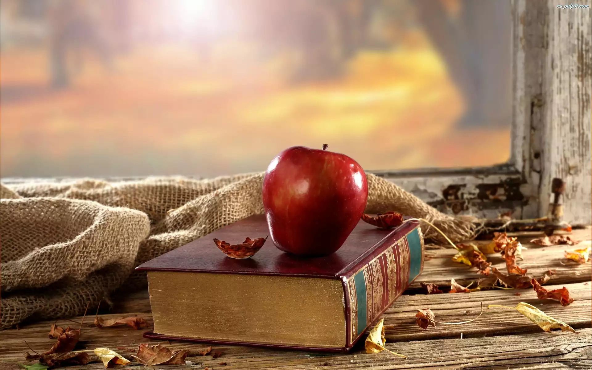 Książka, Okno, Kompozycja, Jesienne, Jabłko, Liście Na Pulpit