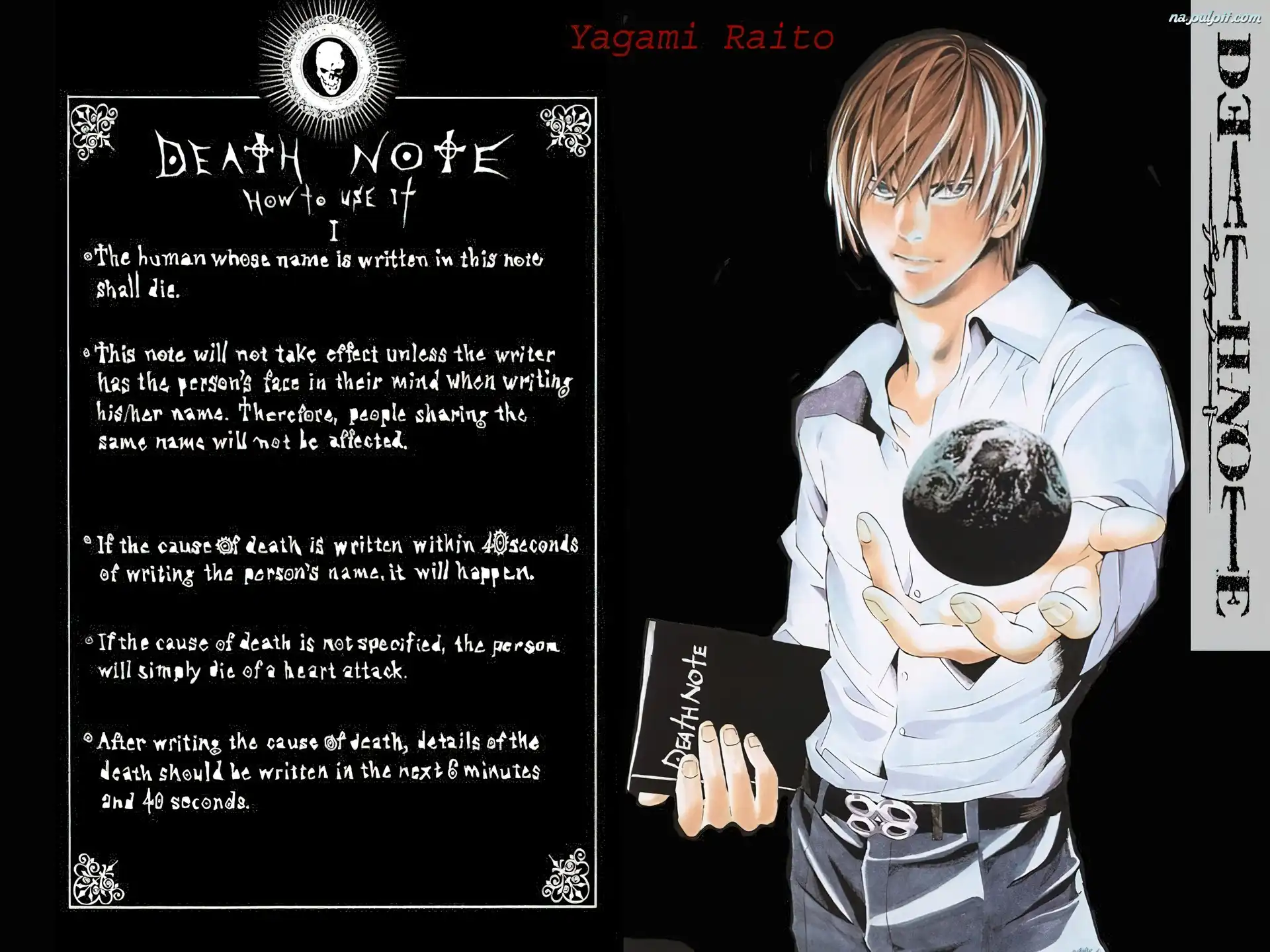 czaszka, chłopak, pasek, kartka, napisy, kula, Death Note, książka Na Pulpit