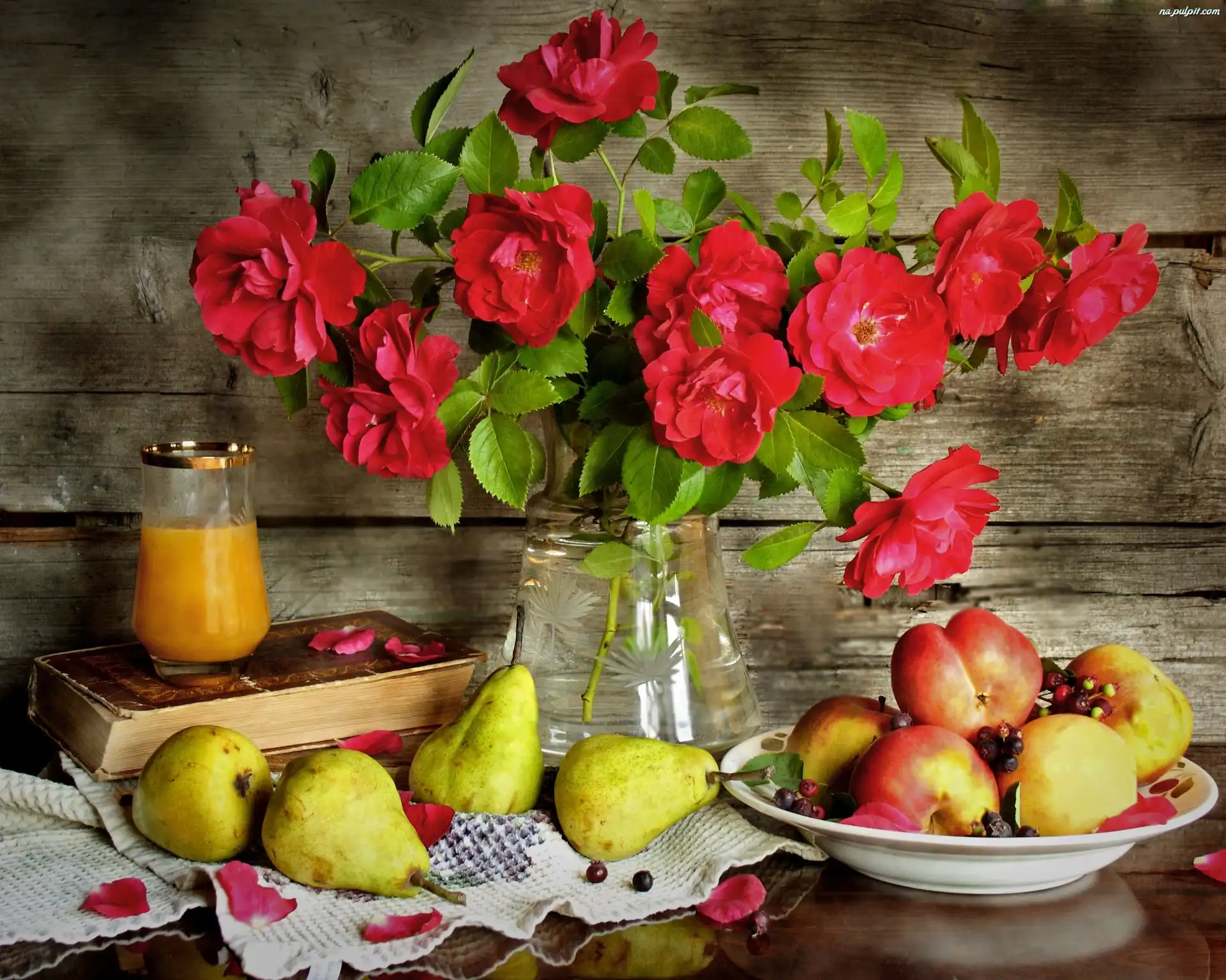 Książka, Gruszki, Jabłka, Róże, Sok Na Pulpit