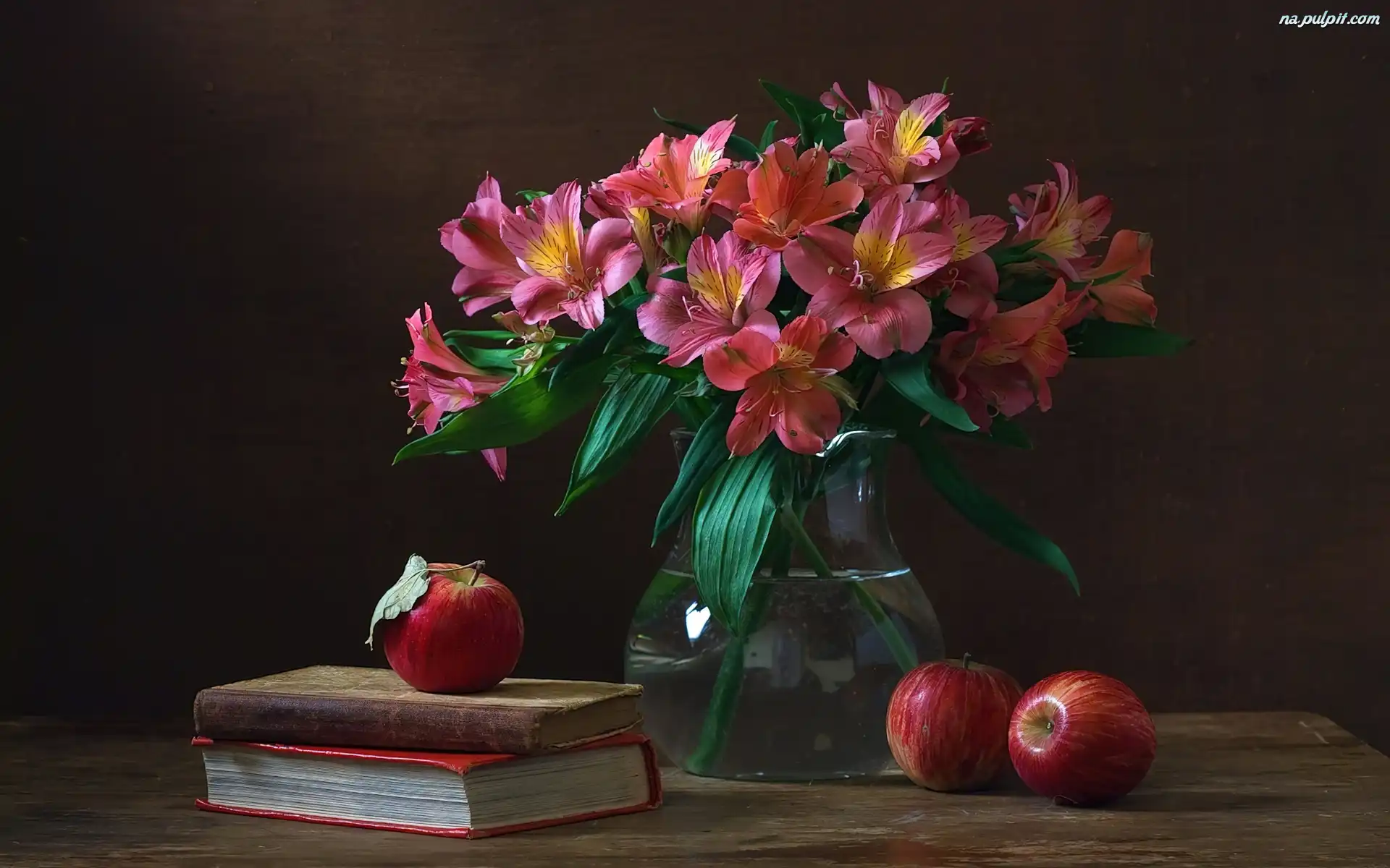 Książki, Kwiatów, Różowych, Bukiet, Jabłka Na Pulpit