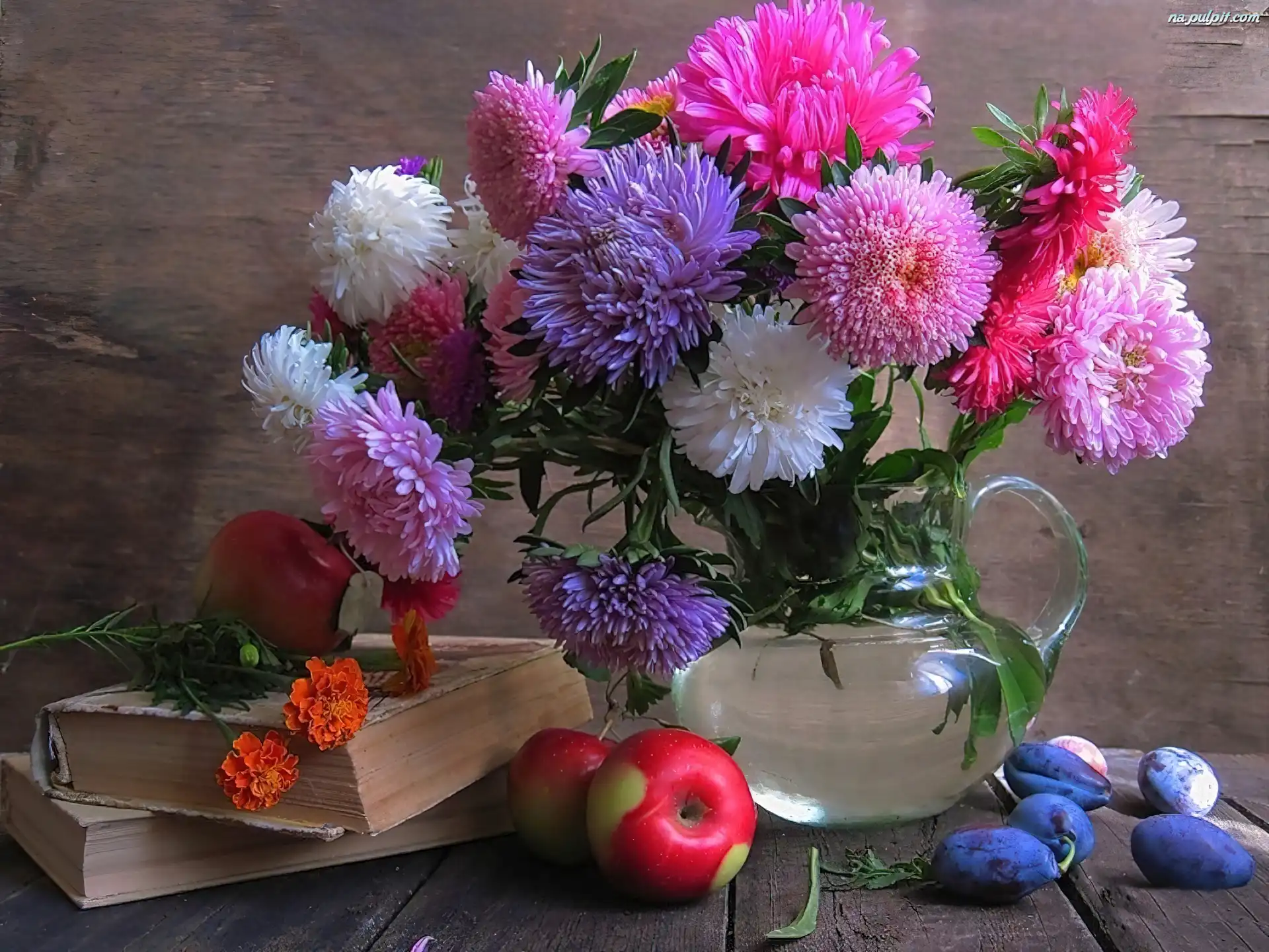 Książki, Śliwki, Astry, Kolorowe, Jabłka Na Pulpit
