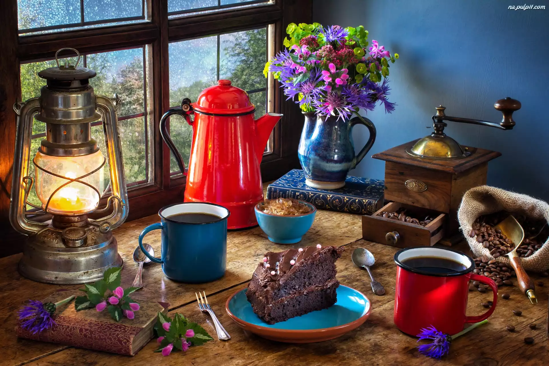 Kwiaty, Ciasto, Kompozycja, Młynek, Dzbanek, Książki, Okno, Ziarna, Garnuszki, Lampa naftowa, Kawa Na Pulpit |