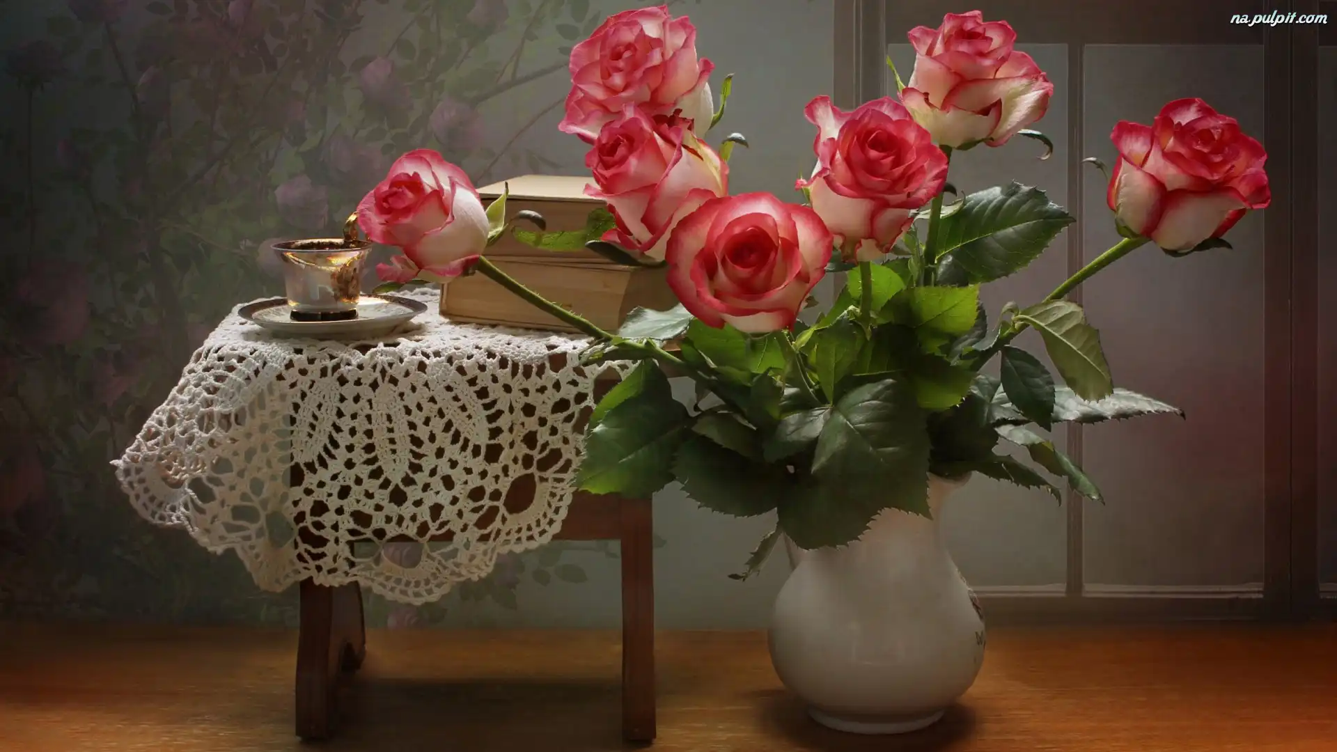 Książki, Serwetka, Szydełkowa, Filiżanka, Róże, Wazon Na Pulpit