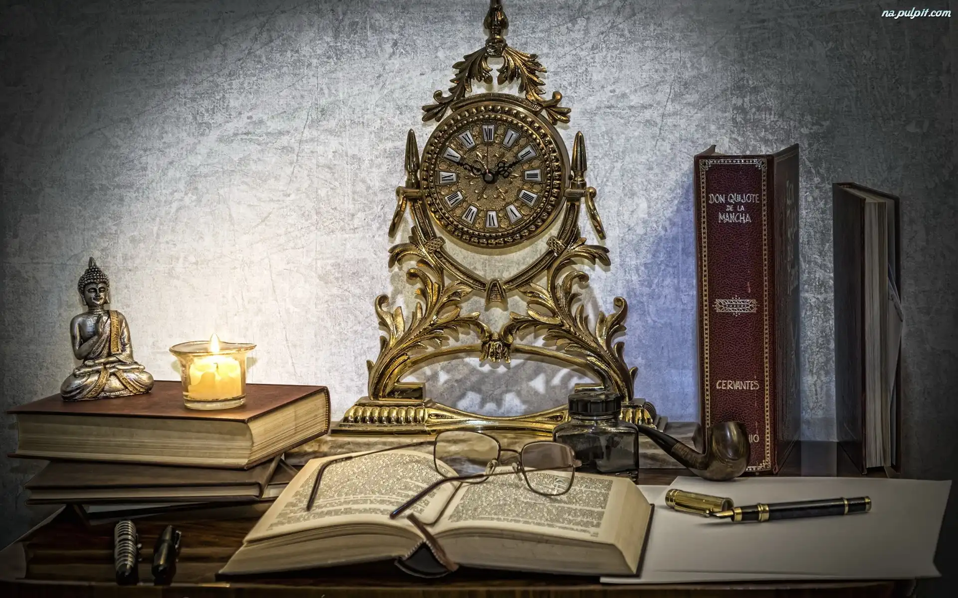Książki, Świeca, Ogień, Okulary, Zegar, Pióro