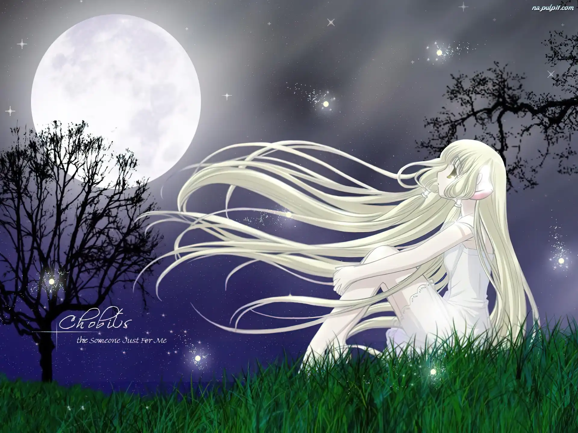 księżyc, trawa, dziewczyna, gwiazdy, Chobits, drzewo Na Pulpit