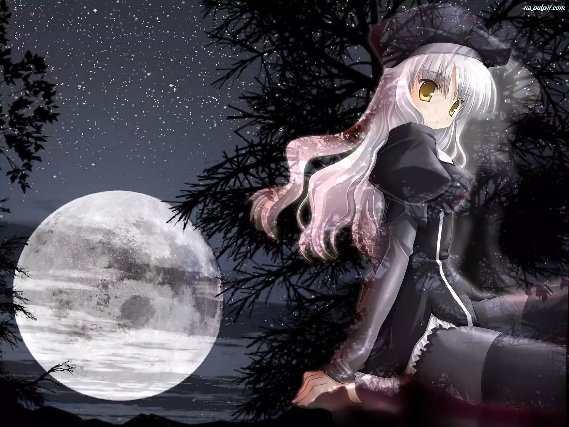 księżyc, Fate Stay Night, drzewa, dziewczyna