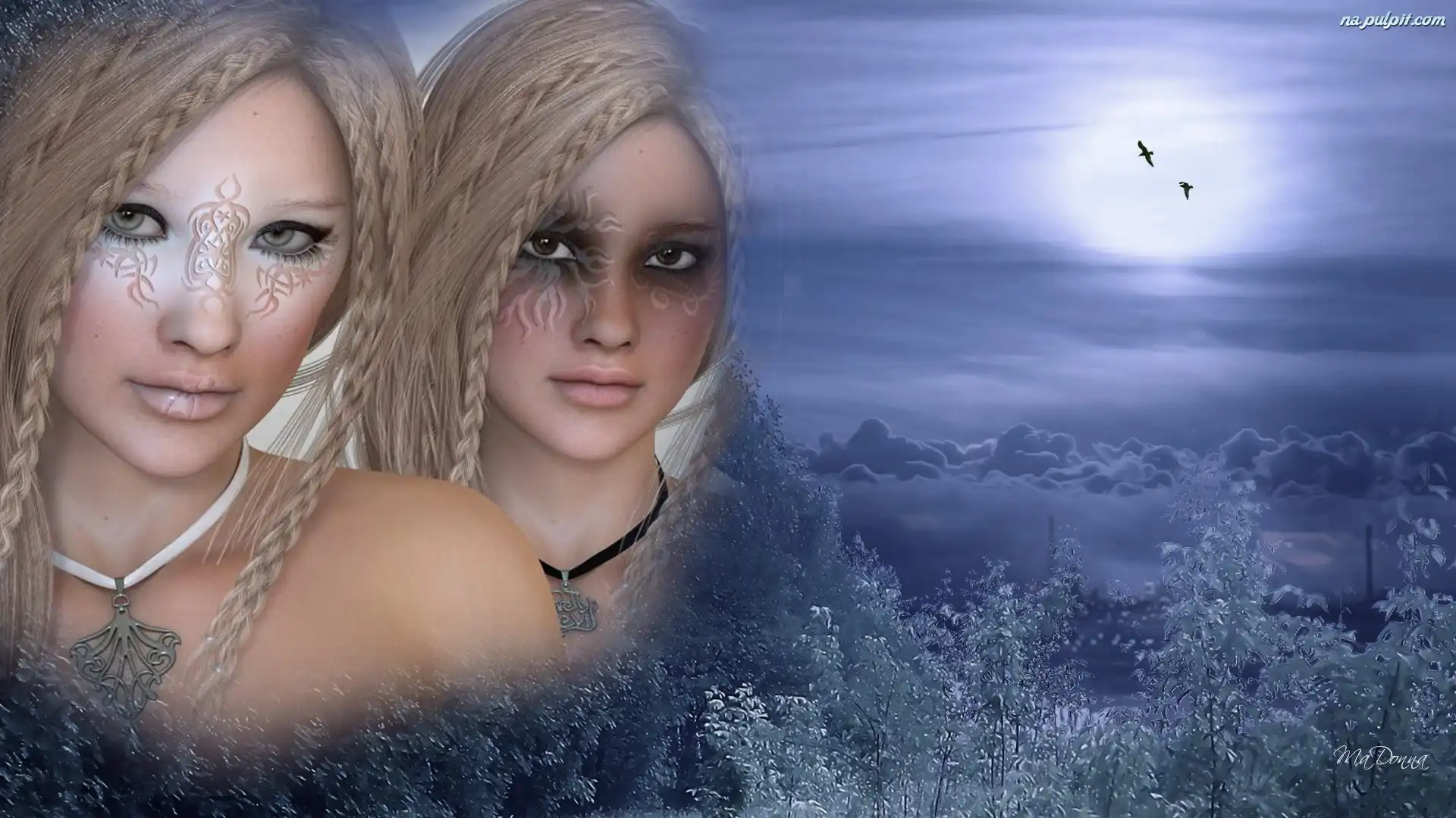 Księżyc, Kobiety, Dwie, Drzewa Na Pulpit