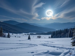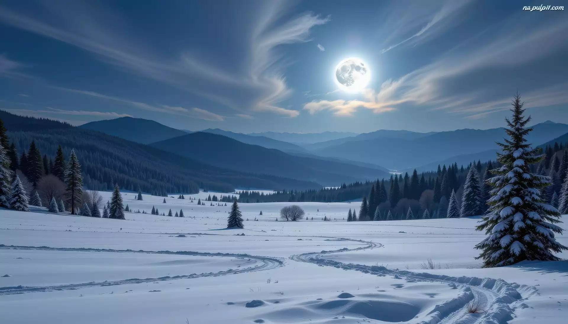 Grafika AI, Góry, Lasy, Zima, Pole, Drzewa, Księżyc