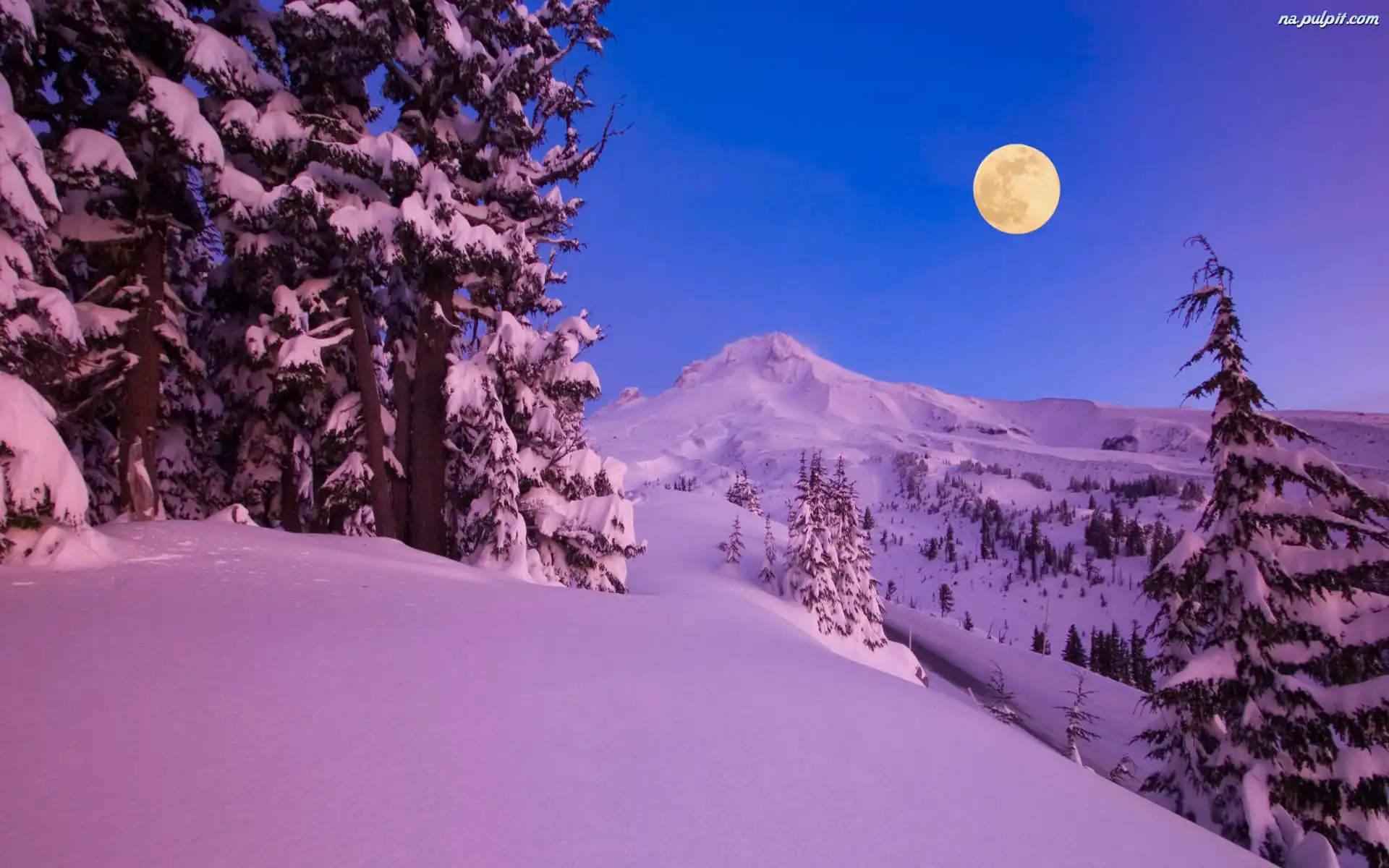 Ksieżyc, Pokryte, Drzewa, Góry, Śniegiem Na Pulpit