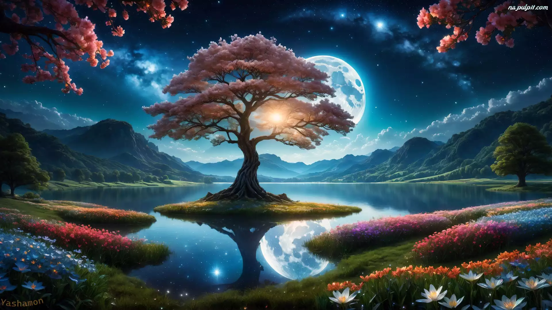 Księżyc, Grafika, Jezioro, Kwiaty, Noc, Drzewo, Góry, Niebo, Gwiazdy Na Pulpit