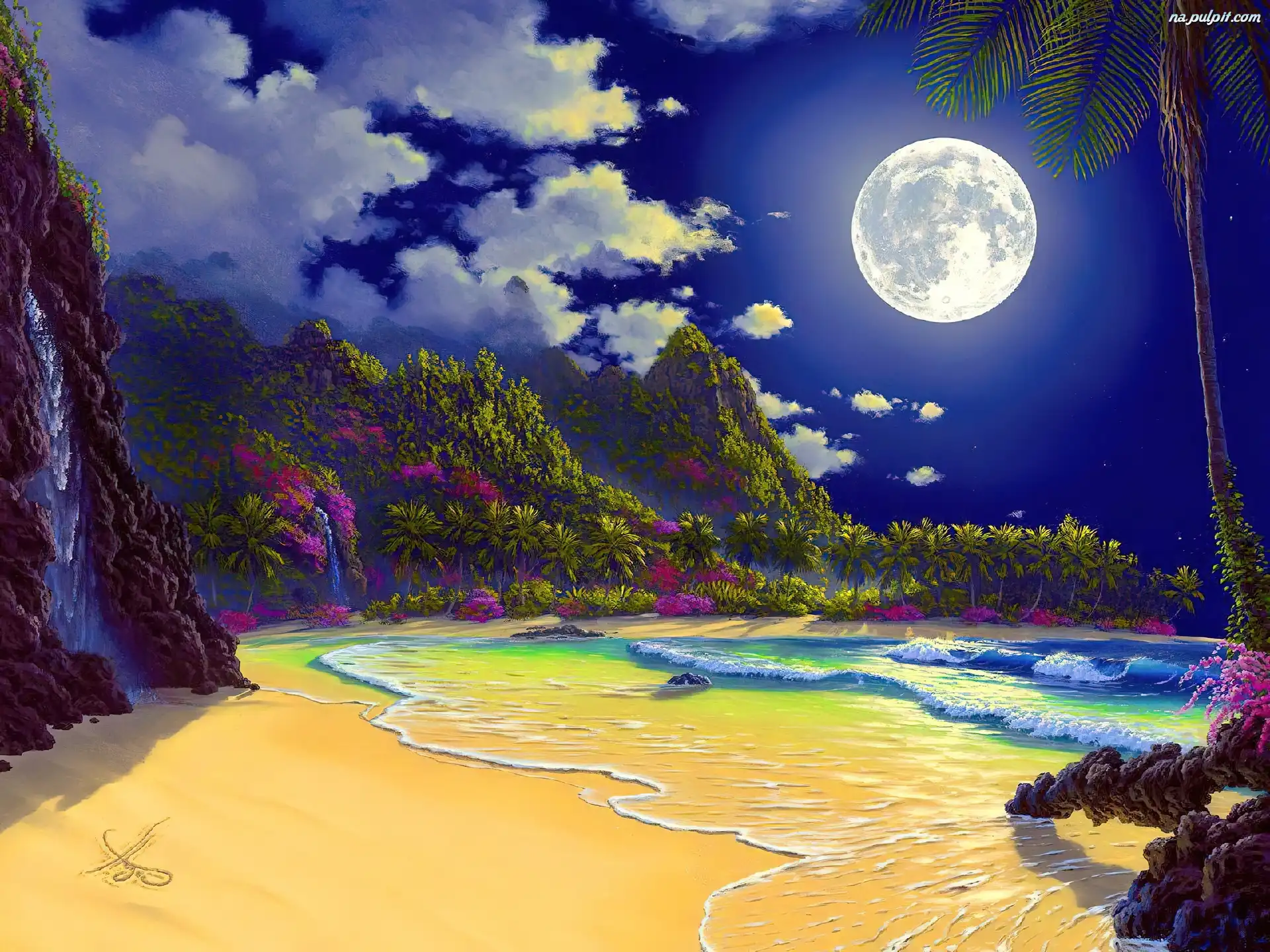 Księżyc, Plaża, Morze, Góry, Noc Na Pulpit