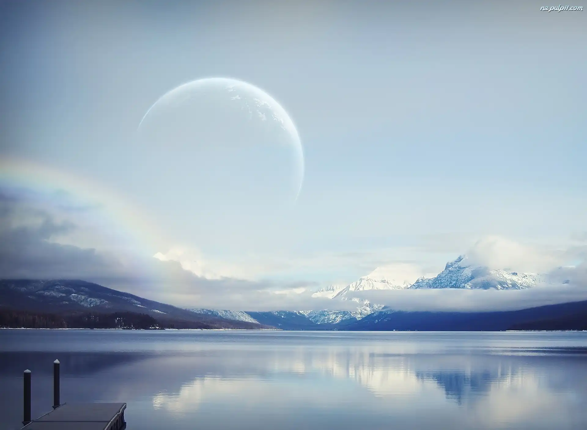 Księżyc, Góry, Jezioro, Tęcza Na Pulpit