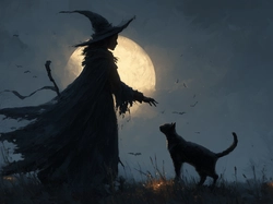 Halloween, Wiedźma, Kot, Księżyc, Czarny, Grafika AI