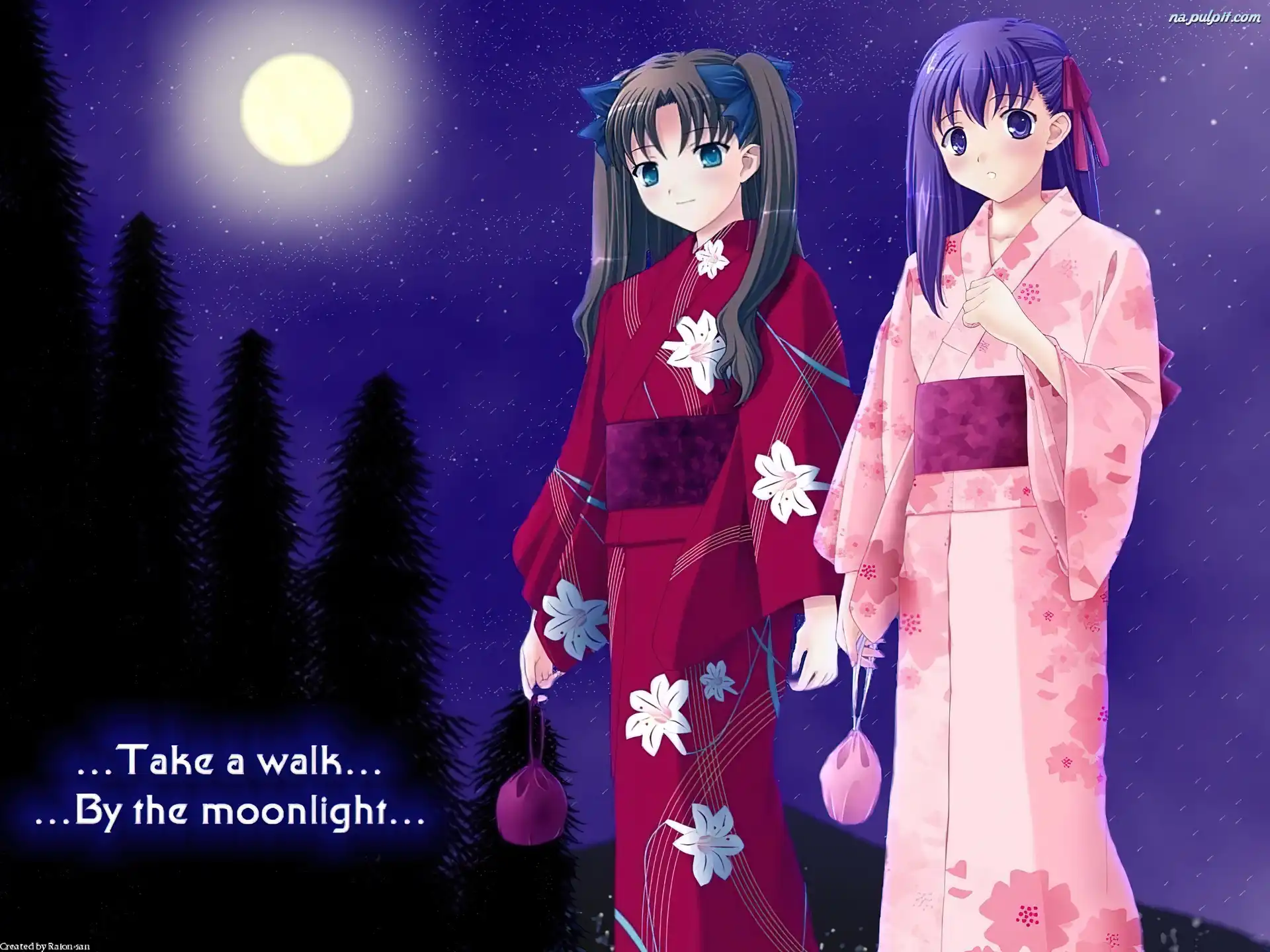 księżyc, dziewczyny, Fate Stay Night, kimono