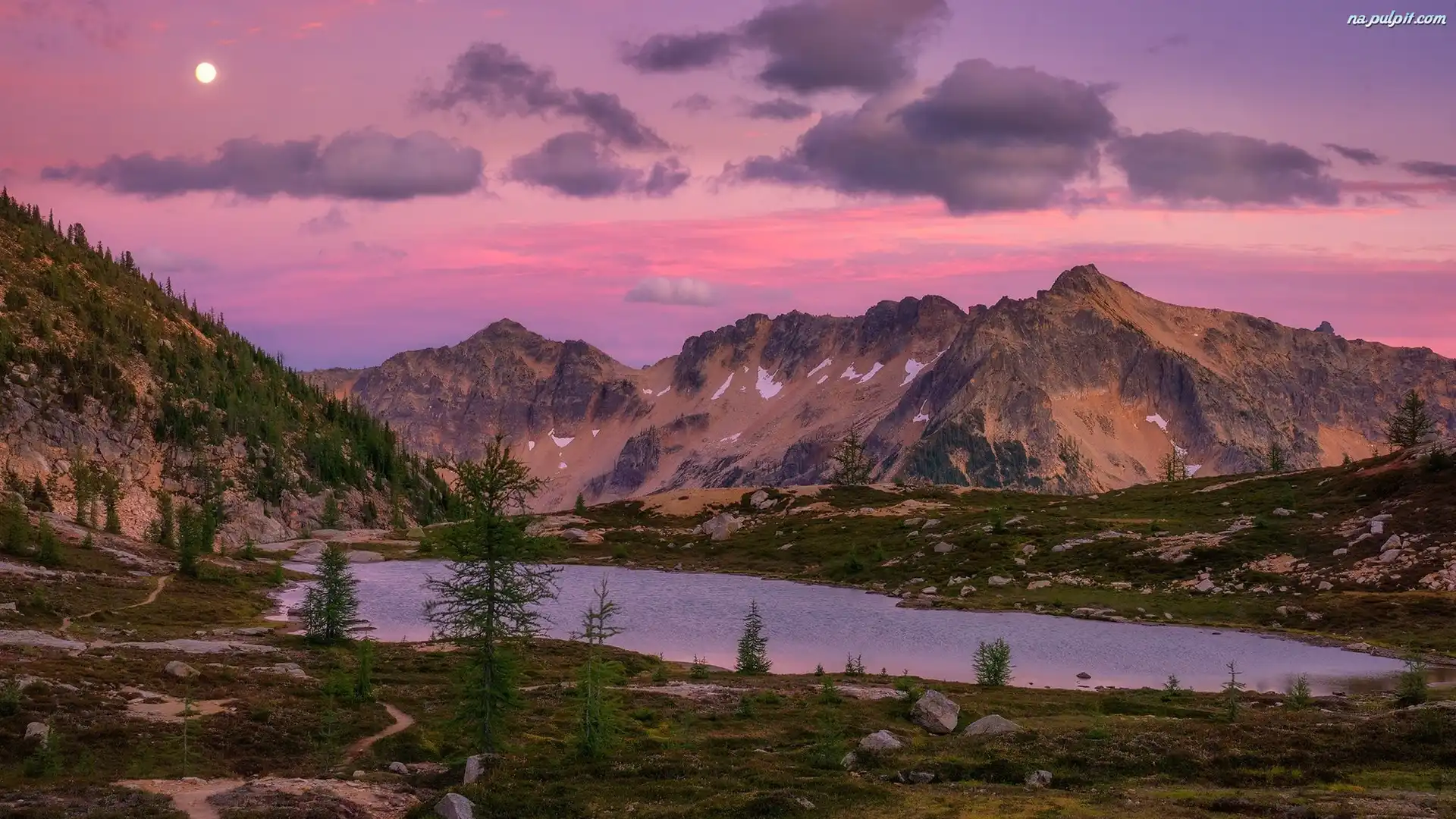 Księżyc, Jezioro, Góry, Poranek, Drzewa Na Pulpit
