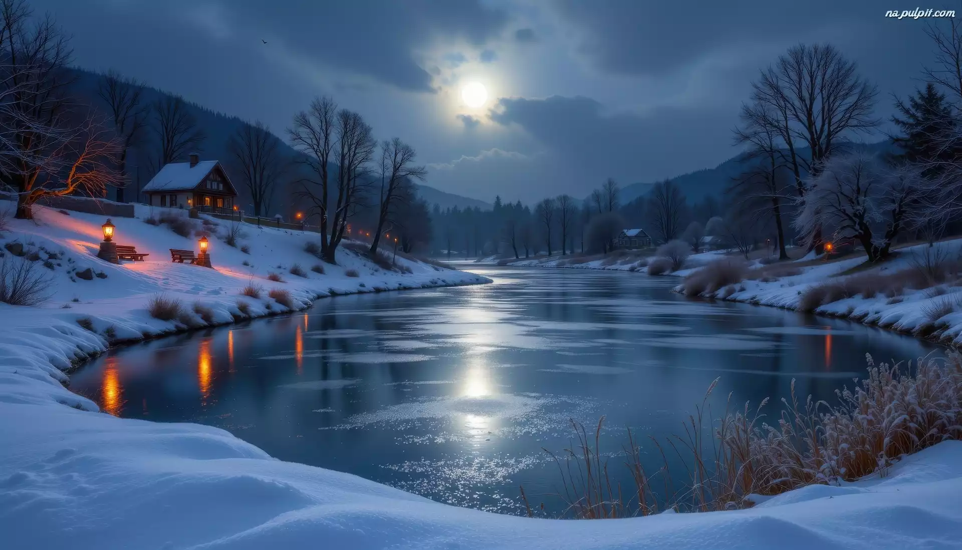 Księżyc, Noc, Jezioro, Dom, Lampy, Las, Zima, Drzewa, Śnieg Na Pulpit