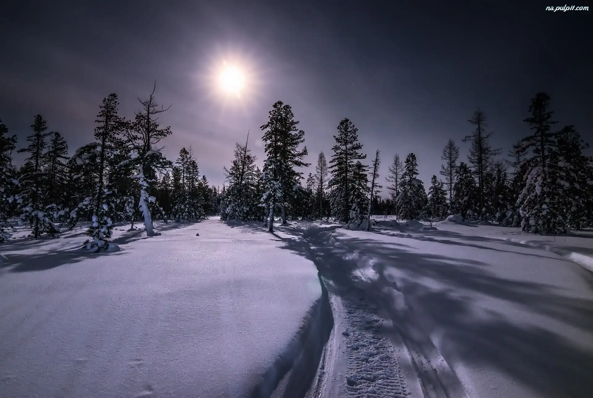 Księżyc, Świerki, Zima, Noc Na Pulpit