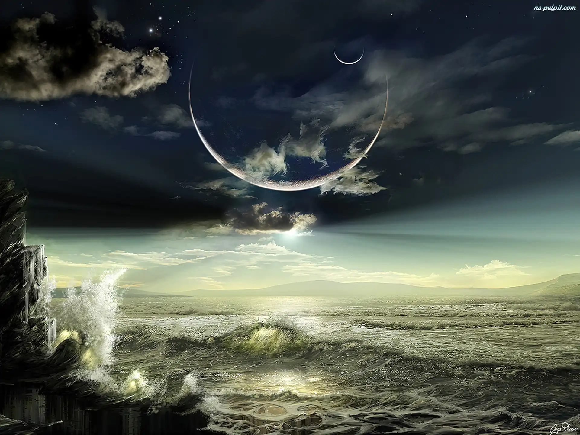 Księżyca, Noc, Fale, Morze, Zaćmienie Na Pulpit