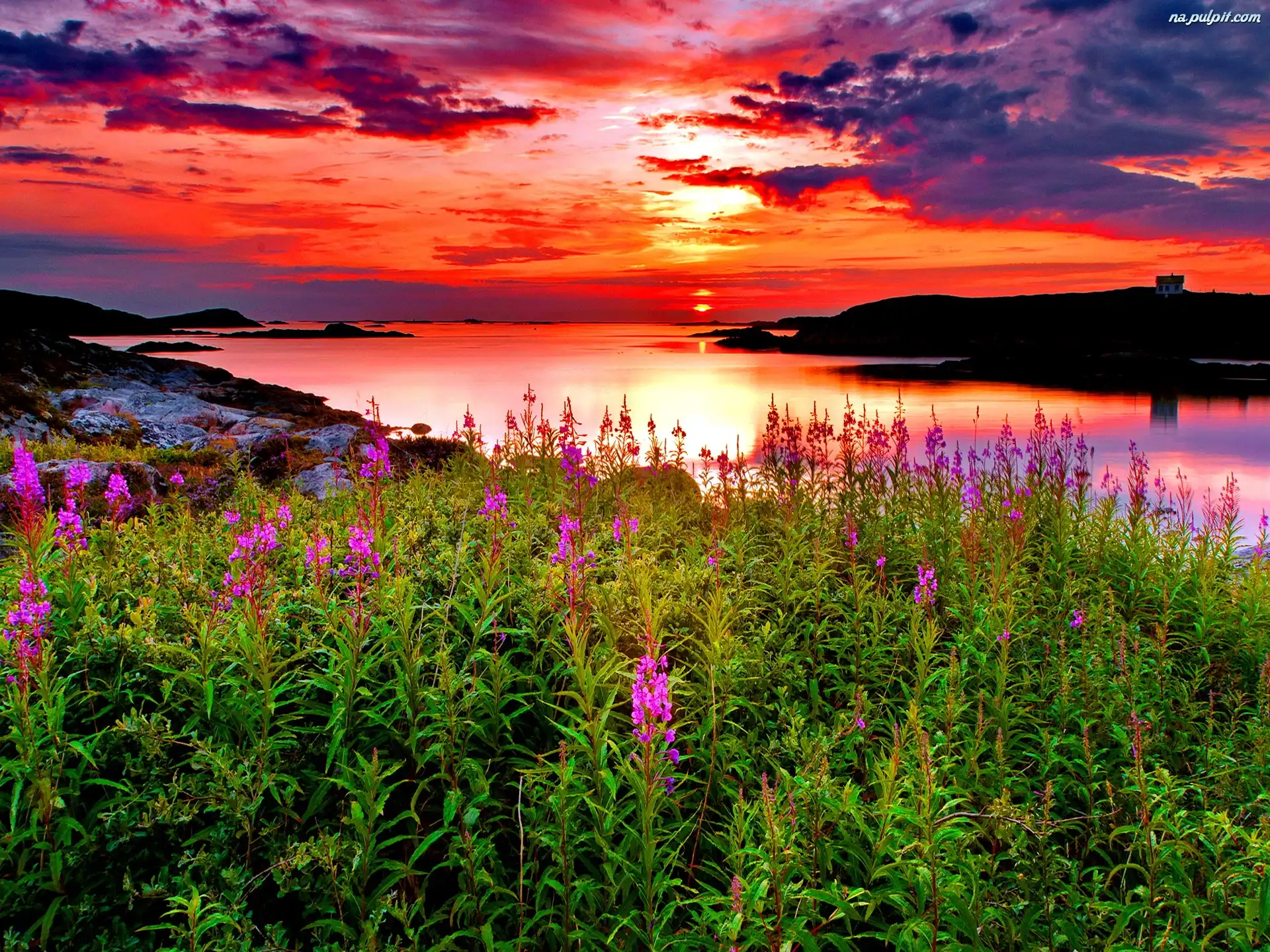 Kwiatki, Jezioro, Zachód Słońca, Łąka Na Pulpit