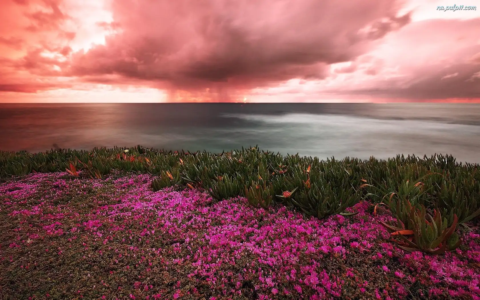 Kwiatki, Różowe, Słońca, Zachód, Chmury Na Pulpit
