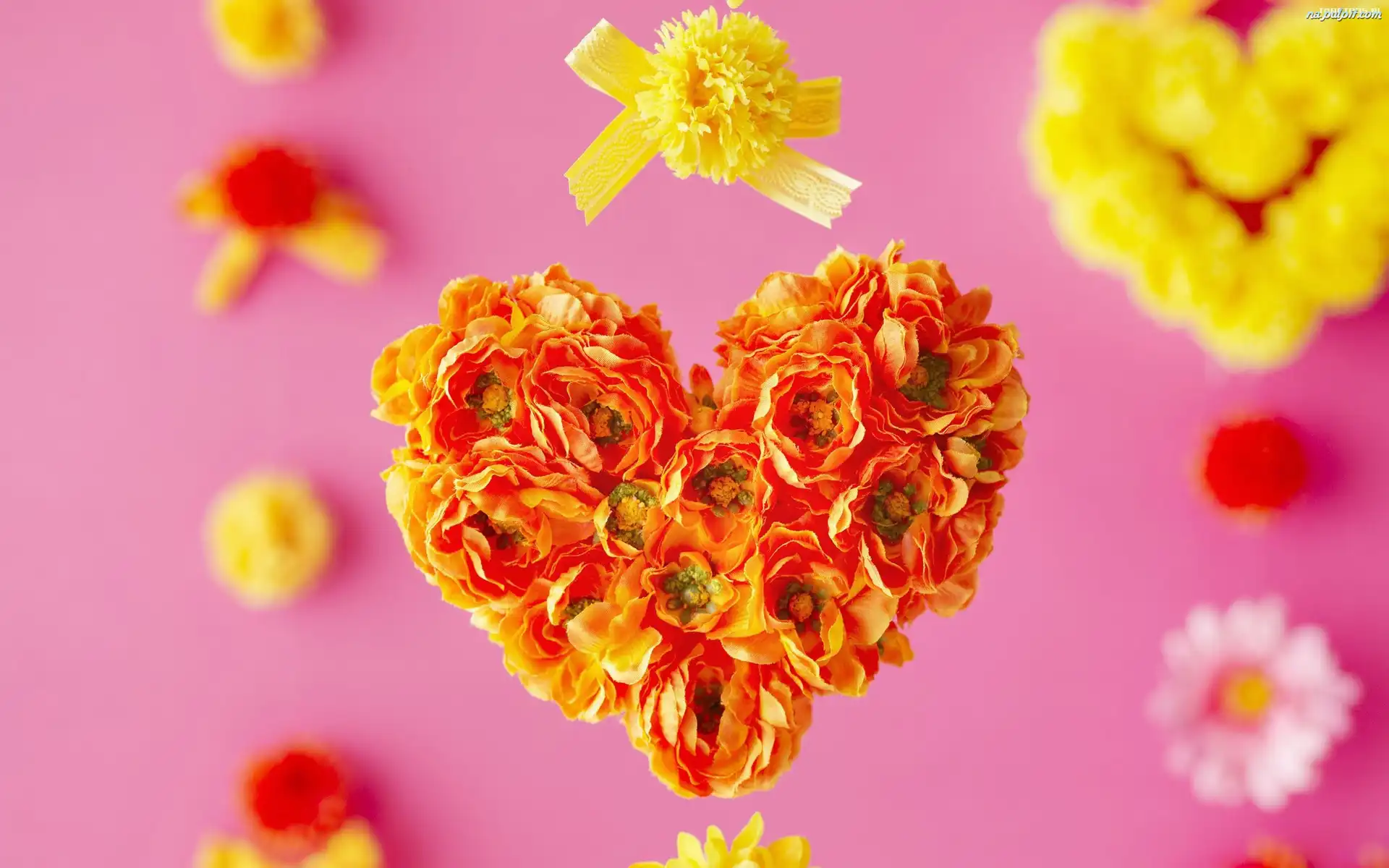 Tło, Kwiatowe, Różowe, Żółte, Serce, Pomarańczowe, Kwiaty