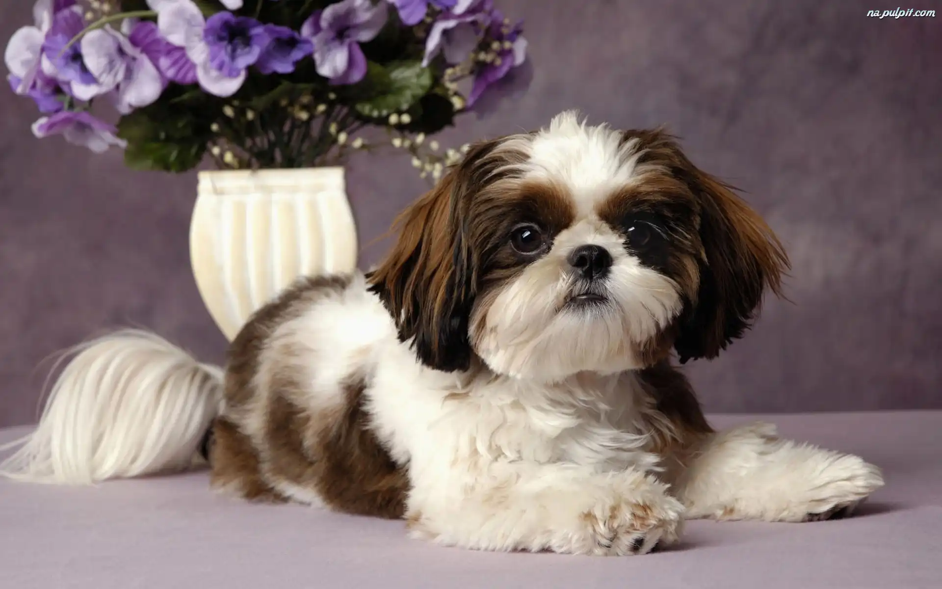 Kwiatuszki, Spaniel Japoński, Piesek, Fioletowe Na Pulpit