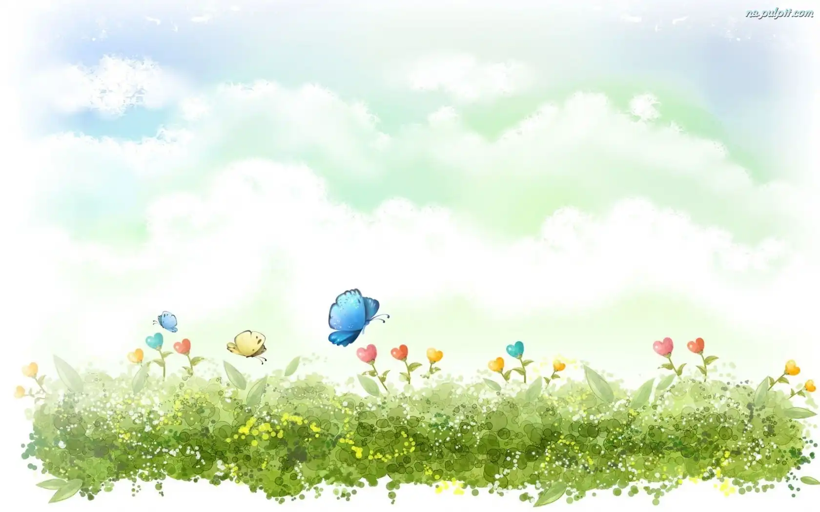 Kwiaty, Chmury, Grafika, Serca, Łąka, Motyl Na Pulpit