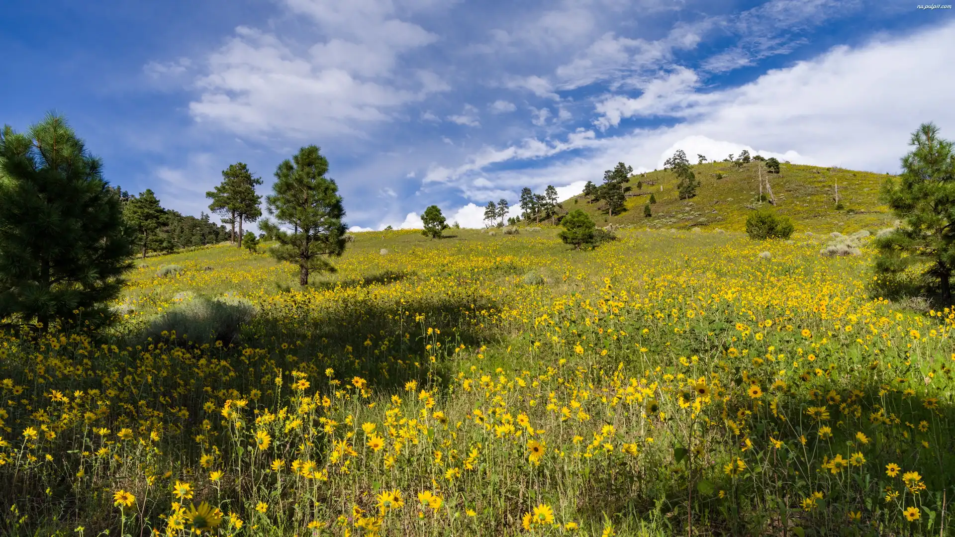 Kwiaty, Wzgórza, Łąka, Drzewa