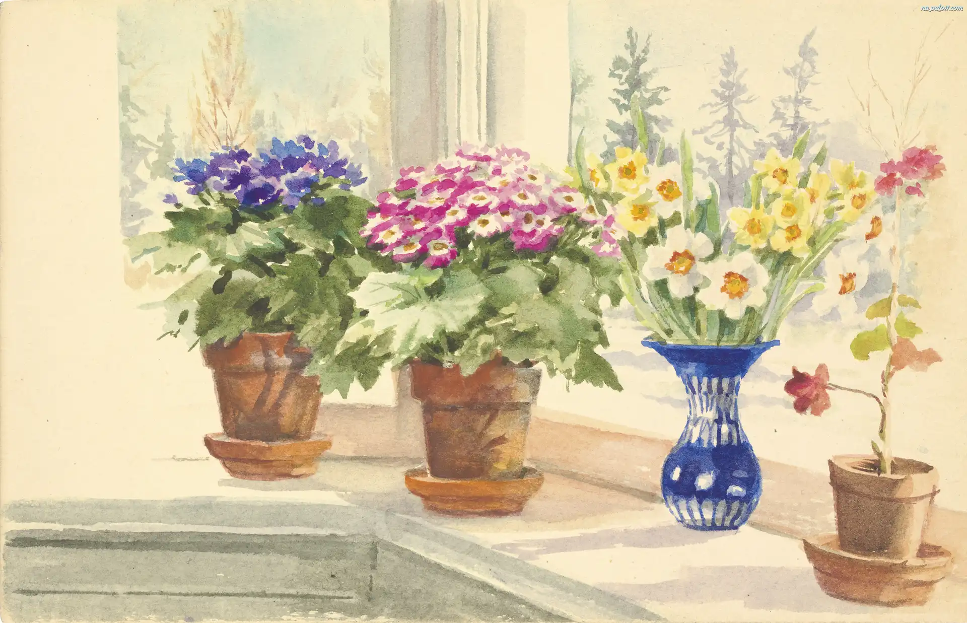 Doniczki, Malarstwo, Akwarela, Wazon, Okno, Olga Alexandrovna, Obraz, Kwiaty Na Pulpit