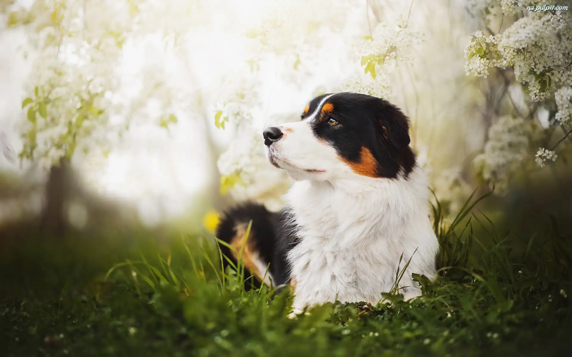 Kwiaty, Owczarek Australijski, Leżący, Australian shepherd Na Pulpit