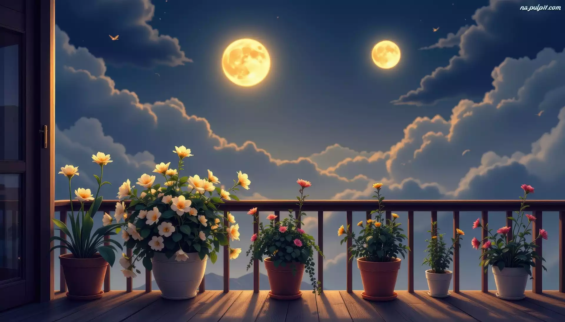 Doniczki, Noc, Chmury, Kwiaty, Księżyce, Balkon Na Pulpit