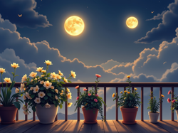 Doniczki, Noc, Chmury, Kwiaty, Księżyce, Balkon