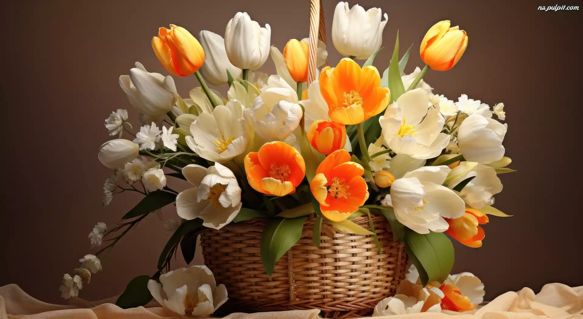 Tulipany, Kwiaty, Białe, Koszyk, Pomarańczowe Na Pulpit