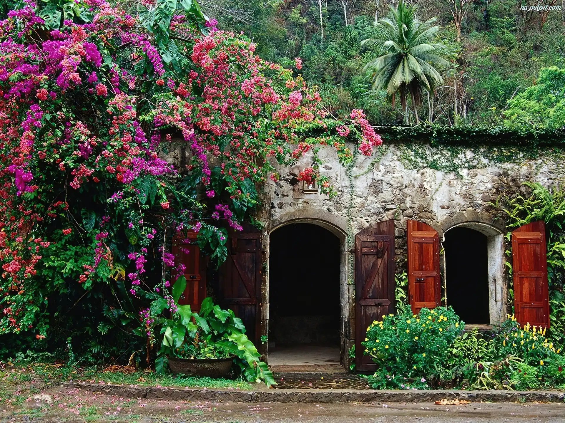 Kwiaty, Drzewa, Budynek, Krzewy Na Pulpit