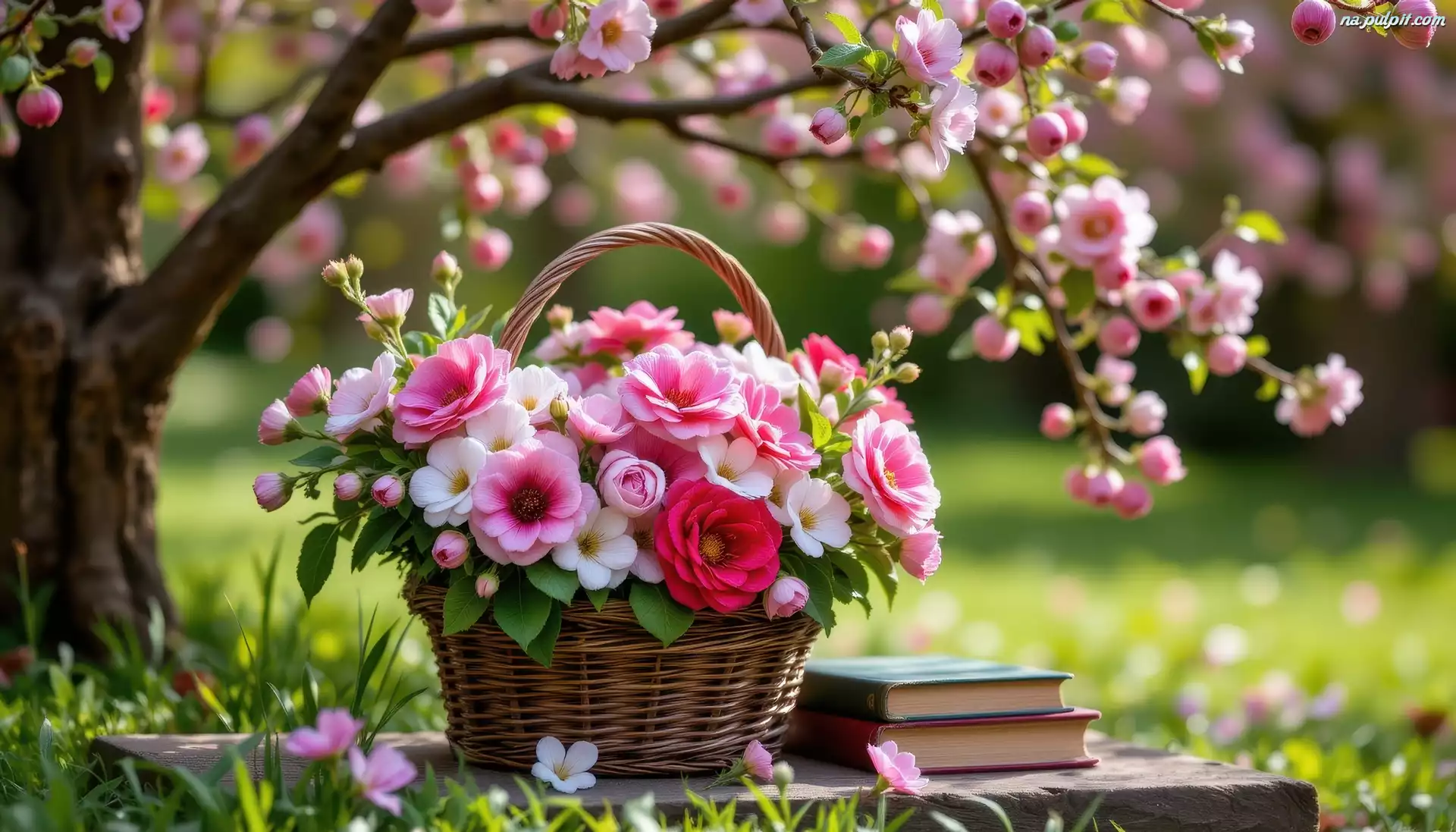 Grafika, Kwiaty, Bukiet, Książki, Koszyk